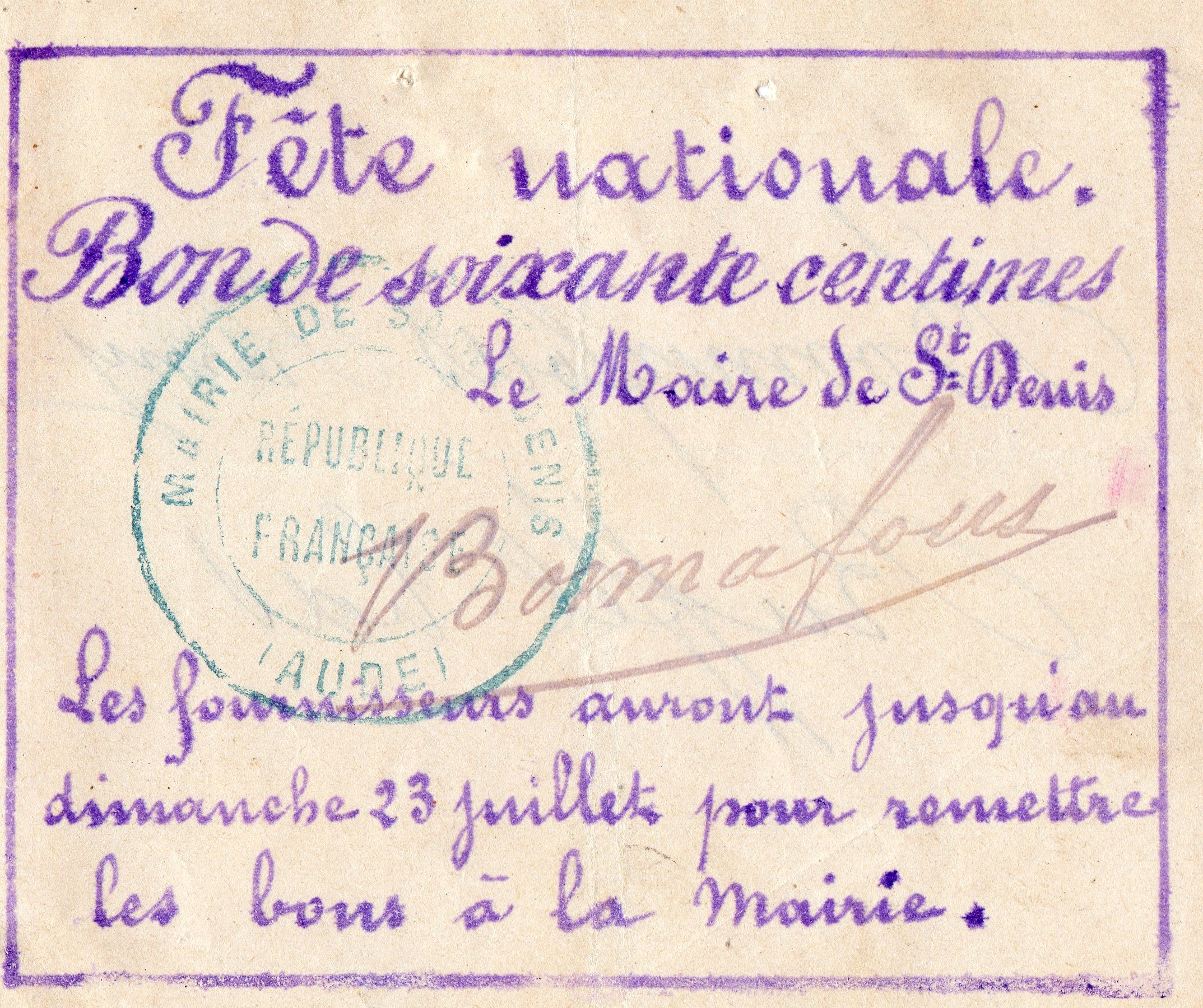 Bon de la fête nationale - Saint Denis - 1905