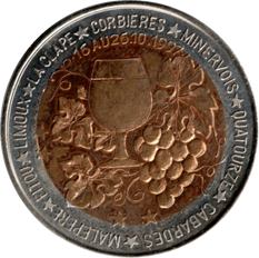 Frappé à l’initiative du Cercle Audois des Numismates Amateurs, ce jeton a circulé principalement dans les murs de la Cité pendant la fête du vin. C’est ce qui justifie le choix de l’illustration du revers.