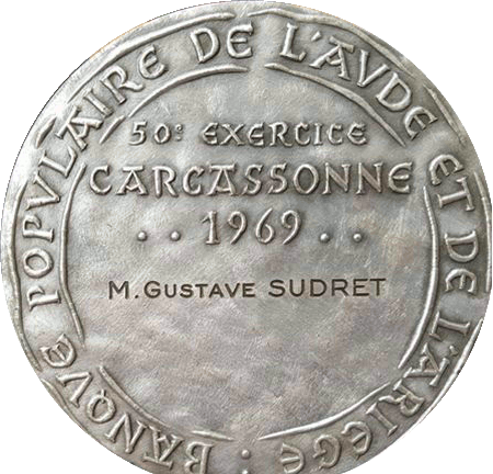 Cette médaille frappée par la Monnaie de Paris à l’occasion du 50° anniversaire de la banque porte à son avers une fidèle reproduction du sceau de Trencavel, vicomte de Béziers seigneur de Carcassonne. Il semblerait au regard du poinçon figurant sur la tranche de l’exemplaire en argent que la fabrication n’ait eu lieu qu’en 1970.