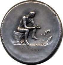 Au revers, un touriste, un érudit assis, examinant un objet à la loupe et, autour de lui, à ses pieds, sur le sol, des fossiles, des plantes, des insectes, des objets d’archéologie, etc. Ce revers portera le nom du souscripteur”